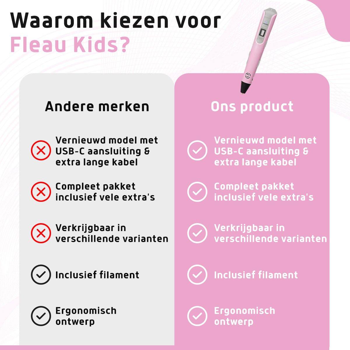 Fleau offers this starter pack in two different colors. A blue one for the boys and a pink one for the girls. The starter package has a CE quality mark and has therefore passed the strict European conditions. We do recommend that you monitor the use of the device by children under 12 years of age. After all, it is an electrical product and the filament is heated