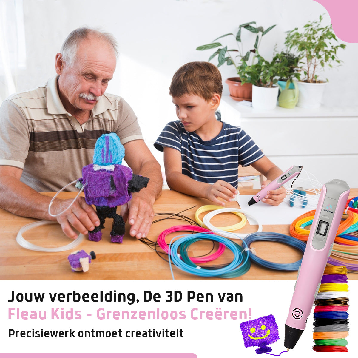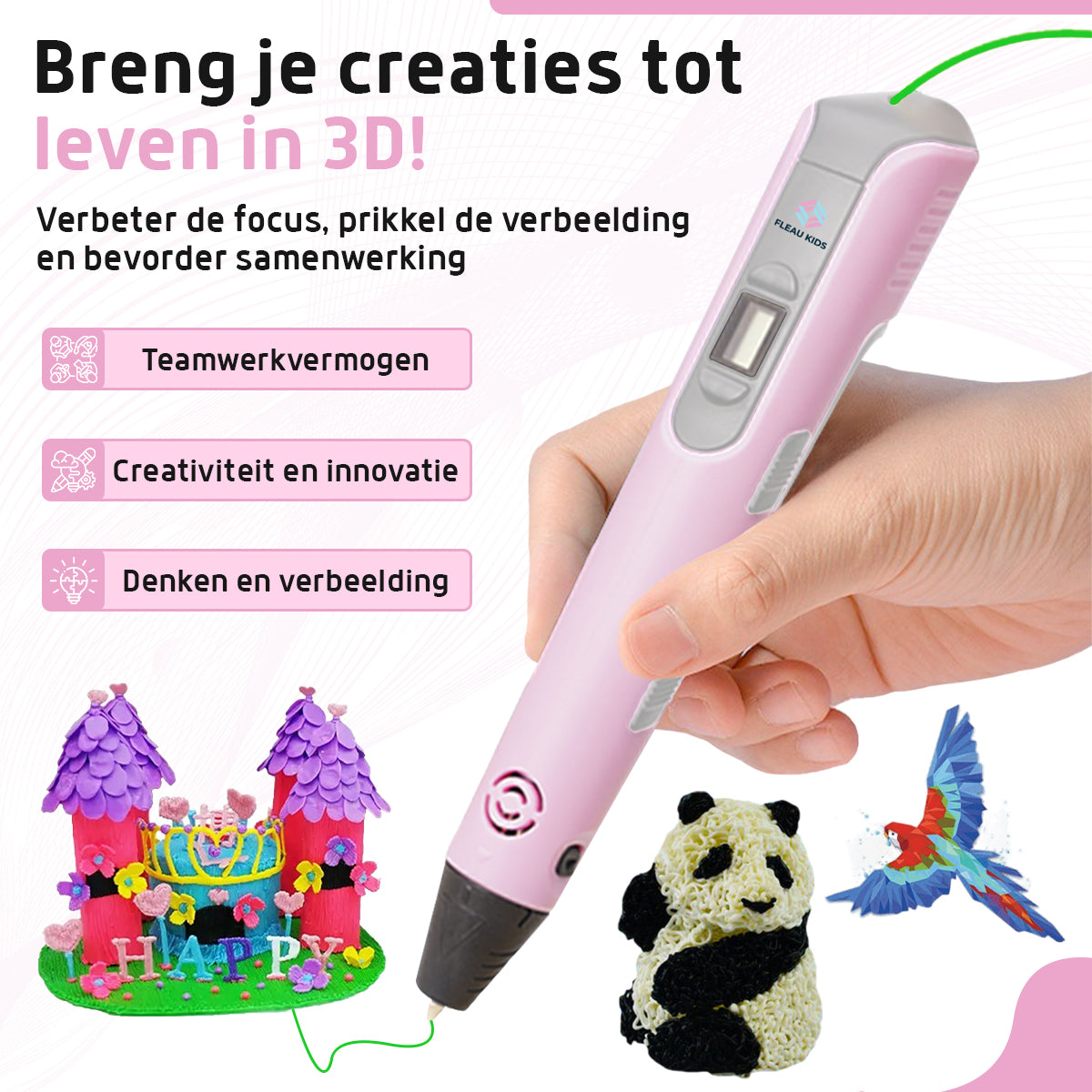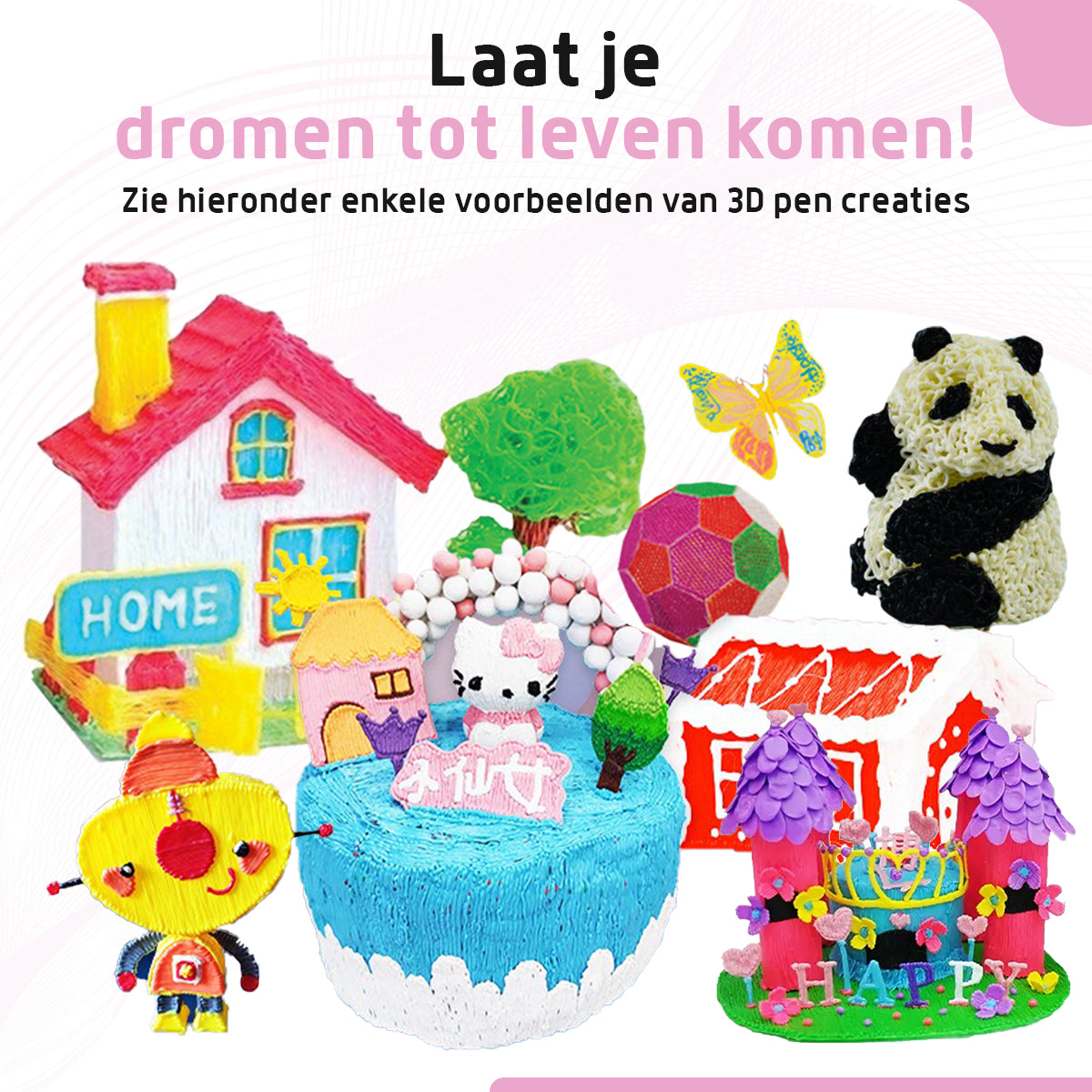 It is every child's dream; make a drawing come to life. With the 3D pen starter package from Fleau, this dream can become reality. There are so many creations possible, almost nothing is too crazy. Unleash your creativity or make creations from the sample booklet. For example, think of a flower, ball, bicycle, etc. This extensive starter package from Fleau comes with 30 different colors of PLA filament. 5 meters of each color. The filament is the thread with which you make a creation. You will also receive a sample booklet, a manual, a charger, finger protectors and a pen stand.